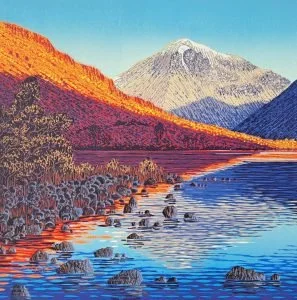 Brought up in Cumbria, Mark moved to London to follow a career in graphic design. Returning in 2006 to Ravenglass to live amongst the landscapes that so inspire him, becoming a member of LAS in 2017, Mark is a printmaker and painter, using vibrant colours to reflect what he finds so engaging in the landscape.
