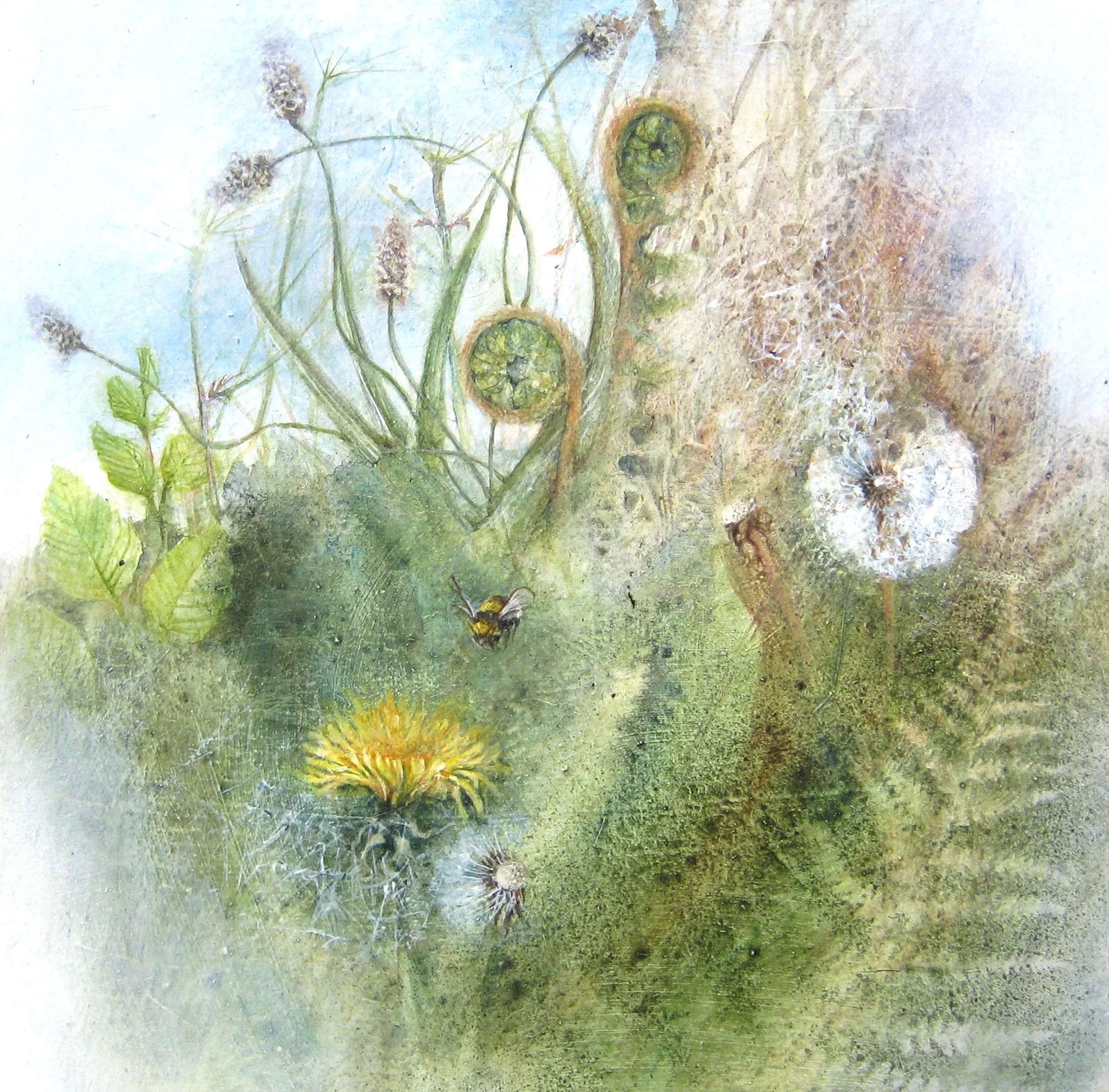 Hedgerow in spring with buff tailed bumble bee - acrylic on board